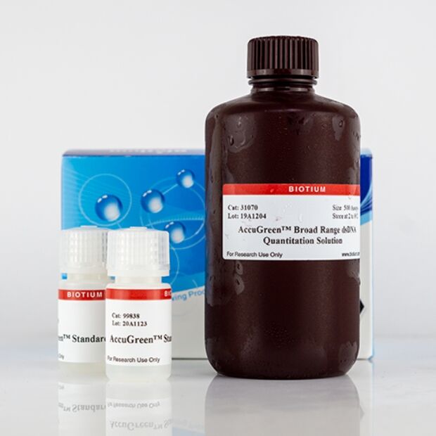 The AccuGreen™ Broad Range dsDNA Quantitation Kit is designed for use with handheld fluorometers such as the Qubit® fluorometers from Thermo Fisher Scientific.
