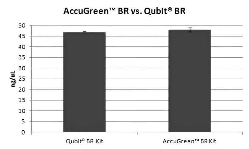 A genomic DNA sample was quantified using both the Qubit® BR kit and the AccuGreen™ BR kit. A nearly identical result was obtained with each kit.