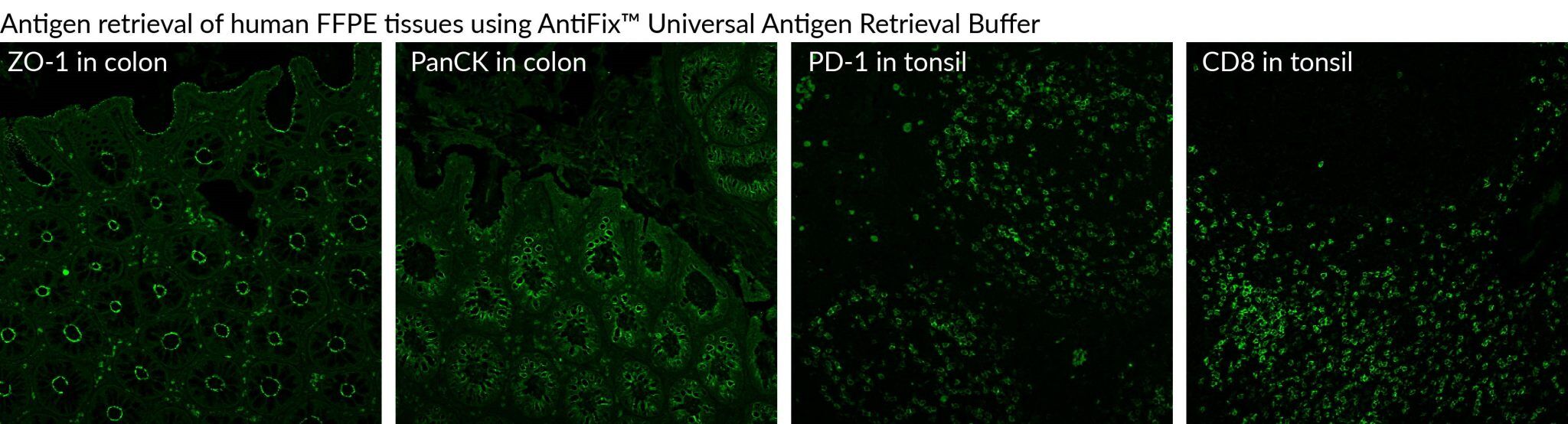 AntiFix™ Universal Antigen Retrieval Buffer provides excellent heat unmasking for a wide variety of targets at neutral pH, reducing the need for buffer optimization.