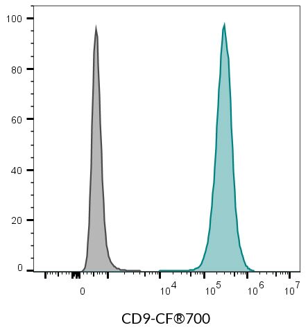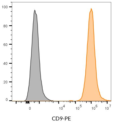 CD9 is a type IV transmembrane glycoprotein with four transmembrane domains. CD9 on pre-B cells may play a role in cell-cell adhesion. In addition, CD9 may play a role in signal transduction mediated by interaction with low molecular weight GTP binding proteins. CD9 is expressed on early B cells, eosinophils, basophils and activated T cells and is a major component of the platelet cell surface. It is also expressed on most non-T acute lymphoblastic leukemia cells and on some acute myeloid and chronic lymphoid leukemia.