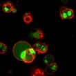 Imaging of apoptosis in staurosporine-treated HeLa cells stained with CF®594 Annexin V (red, apoptotic cell surface probe) and Oxazole Yellow (green, dead cell nuclear stain). All nuclei are stained blue with Hoechst.