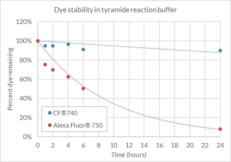 CF®740 free acid or Alexa Fluor® 750 free acid was diluted to 2 uM in 1X Tyramide Amplification Buffer with 0.0015% hydrogen peroxide and incubated at room temperature, protected from light. Dye concentration was measured by absorbance at the time points shown. CF®740 remained stable in the presence of hydrogen peroxide over 24 hours (≤90% of the starting dye concentration), while Alexa Fluor® 750 degraded to less than 10% of the starting concentration after 24 hours.