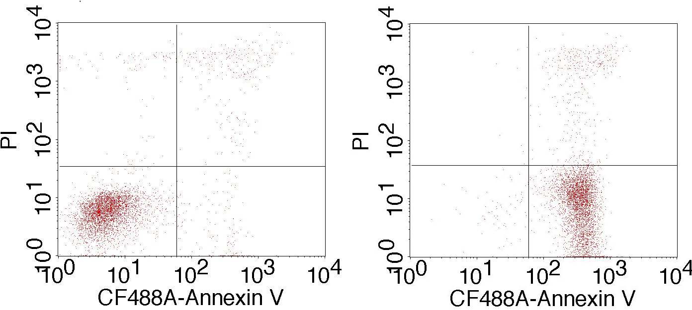 In apoptotic cells, the phospholipid phosphatidylserine (PS) is translocated from the inner to the outer surface of the plasma membrane, which targets the dying cells for phagocytosis. The human anticoagulant, Annexin V, is a 35 kDa Ca2 -dependent phospholipid binding protein with a high affinity for PS. Annexin V labeled with CF®488A labels apoptotic cells with green fluorescence by binding to PS exposed on the outer leaflet. Our CF®488A dye is superior to fluorescein/FITC because it is not affected by pH and has far better photostability.