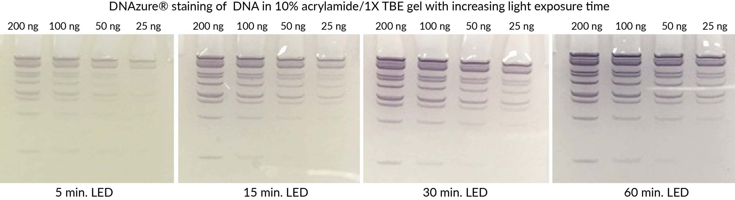 We have tested a variety of different light sources for the development of DNAzure® bands in an agarose gel. We have found that most light sources will work, but how long the development takes is dependent on the brightness of the light. The fastest band development is seen with our Glo-Plate™ White Photoactivation Device and Glo-Plate™ 2.0 Blue LED Illuminator. We have also seen good results with other bright, white LED lights. Other light sources that work but take more time include an LED desk lamp and a cell phone light. We found that a 600W halogen lamp did not work well- it was too hot, which melted the gel.