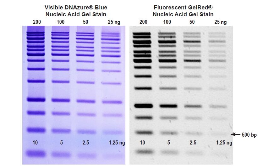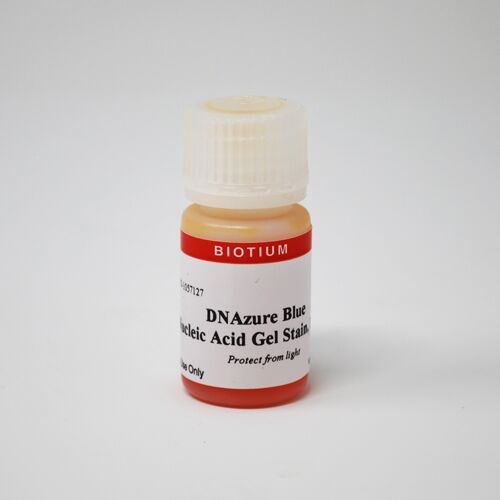 DNAzure® Blue Nucleic Acid Gel Stain is a DNA-binding dye that turns from colorless to deep blue upon exposure to bright light. After color development, the stain also has broad emission near-infrared fluorescence that can be imaged using the LI-COR®, Odyssey®, or similar near-IR imaging systems. The sensitivity of detection is similar for visible color and near-IR imaging. DNAzure® is compatible with agarose gels or polyacrylamide gels as well as downstream applications such as sequencing and cloning. The dye efficiently removed from DNA by common gel extraction kits that utilize silica-based DNA purification columns.
