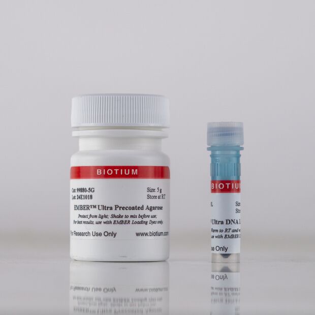 EMBER™ Ultra Precoated Agarose is ultra-pure molecular biology grade agarose with low electroendosmosis that is precoated with Biotium’s fluorescent EMBER™ Ultra Dye. This novel gel system using EMBER™ Ultra Precoated Agarose with EMBER™ Ultra Loading Dye is more sensitive than currently available DNA dyes, allowing detection of as little as ≤1 ng DNA. The gel system does not require a post-electrophoresis staining step, for convenient and fast results. EMBER™ Ultra Precoated Agarose gives excellent results at percentages between 1% and 5% agarose, for analyzing different sizes of DNA. EMBER™ Ultra also has excellent sensitivity for single-stranded DNA and small DNA fragments. The dye will also detect RNA, but for best results with RNA, we recommend our EMBER™ Ultra RNA Agarose Gel Kit.