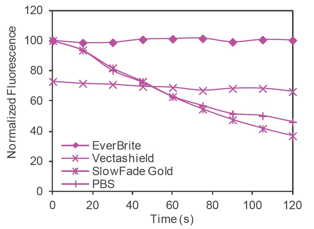 EverBrite™ provides a high level of protection from photobleaching to prolong fluorescence over a wide range of wavelengths. EverBrite™ Mounting Medium has a refractive index of 1.46, which is well-matched to the refractive indices of coverslip glass and immersion oil (1.5). The mounting medium remains liquid and permits immediate imaging of slides and tissues after sealing the cover slip edges with nail polish or Biotium’s CoverGrip™ Coverslip Sealant. After sealing, the slides can be stored at 4°C for a year or longer. EverBrite is available with or without DAPI for nuclear counterstaining. Unlike VectaShield®, EverBrite™ is compatible with cyanine-based fluorophores like Cy® dyes.