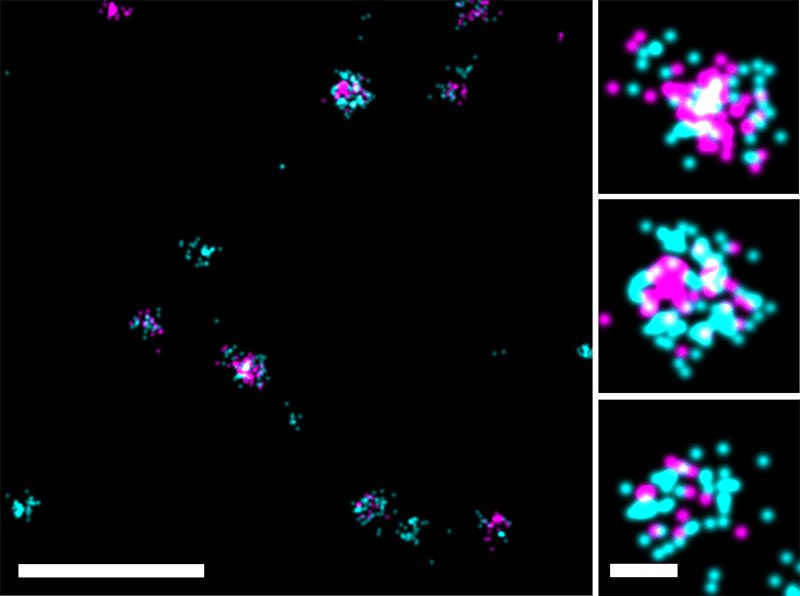 Super-resolution dSTORM images of human colorectal cancer cell line derived EVs. EVs were stained with anti-tetraspanin antibodies (an anti-CD9/CD63/CD81 cocktail, all conjugated to CF®647, shown in magenta) together with 1X ExoBrite™ 560/585 (in cyan). Samples were prepared using ONI’s EV Profiler Kit and acquired using the Nanoimager S Mark II from ONI (Oxford Nanoimaging, UK). Data was processed using a beta-release version of CODI, ONI’s cloud-based data analysis platform. Scale bars are 500 nm (zoomed out, left panel) and 50 nm for single-EV panels (right). Image courtesy of ONI.