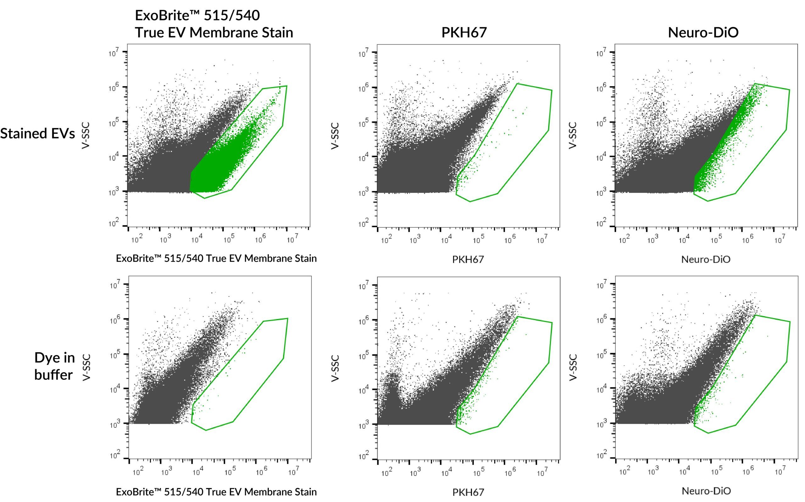 Membrane dyes like PKH, DiO, and DiI, while common tools for labeling EVs, can pose significant challenges when used for EV staining. For example, membrane dyes often have poor solubility and thus form aggregates that can be confused with EVs. ExoBrite™ True EV Membrane Stains were designed specifically to address the issues of membrane dye aggregation while remaining a true lipophilic membrane stain for pan-EV labeling.