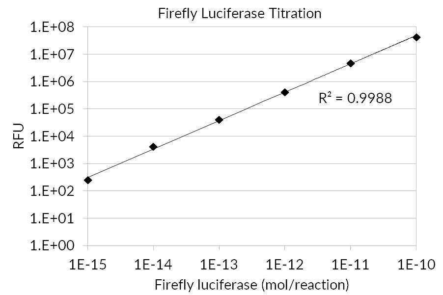 Firefly luciferase is widely used as a reporter for studying gene regulation and function, and for pharmaceutical screening. It is a very sensitive genetic reporter due to the absence of endogenous luciferase activity in mammalian cells or tissues. Firefly luciferase is a 62,000 Dalton protein, which is active as a monomer and does not require subsequent processing for its activity. The enzyme catalyzes ATP-dependent D-luciferin oxidation to oxyluciferin, producing light emission. Firefly luciferase follows Michaelis-Menten kinetics and, as a result, maximum light output is not achieved until the substrate and co-factors are present in large excess. When assayed under these conditions, light emitted from the reaction is directly proportional to the number of luciferase enzyme molecules.