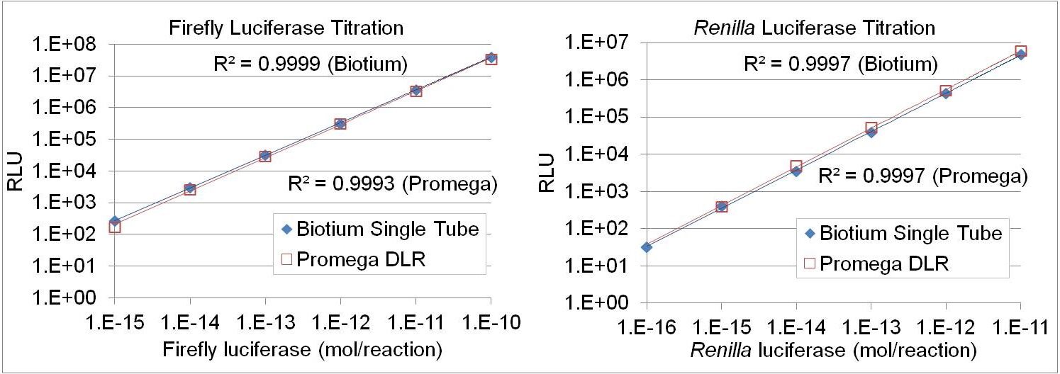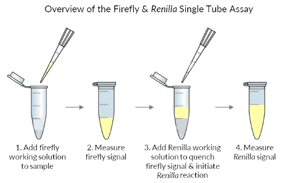 The Firefly & Renilla Luciferase Single Tube Assay is a combined luciferase assay allowing sequential measurement of Firefly and Renilla luciferase activity in the same sample with high sensitivity and linearity. Firefly luciferase activity is measured first, then Renilla Luciferase Assay Buffer 2.0 is added to the sample to simultaneously quench firefly luciferase activity and measure Renilla luciferase activity. The Renilla Luciferase Assay Buffer 2.0 quenches the firefly luciferase activity to the level of untransfected cells, allowing sequential measurement of firefly and Renilla luciferase activity in the same sample.