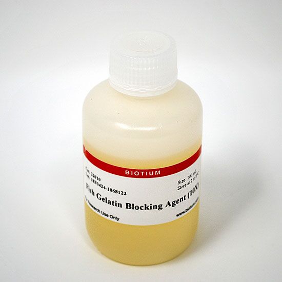 10X Fish Gelatin Blocking Agent is a solution of cold water fish skin gelatin that can be used to make blocking buffers to minimize non-specific antibody binding in immunodetection procedures such as western blotting, immunofluorescence, and IHC.