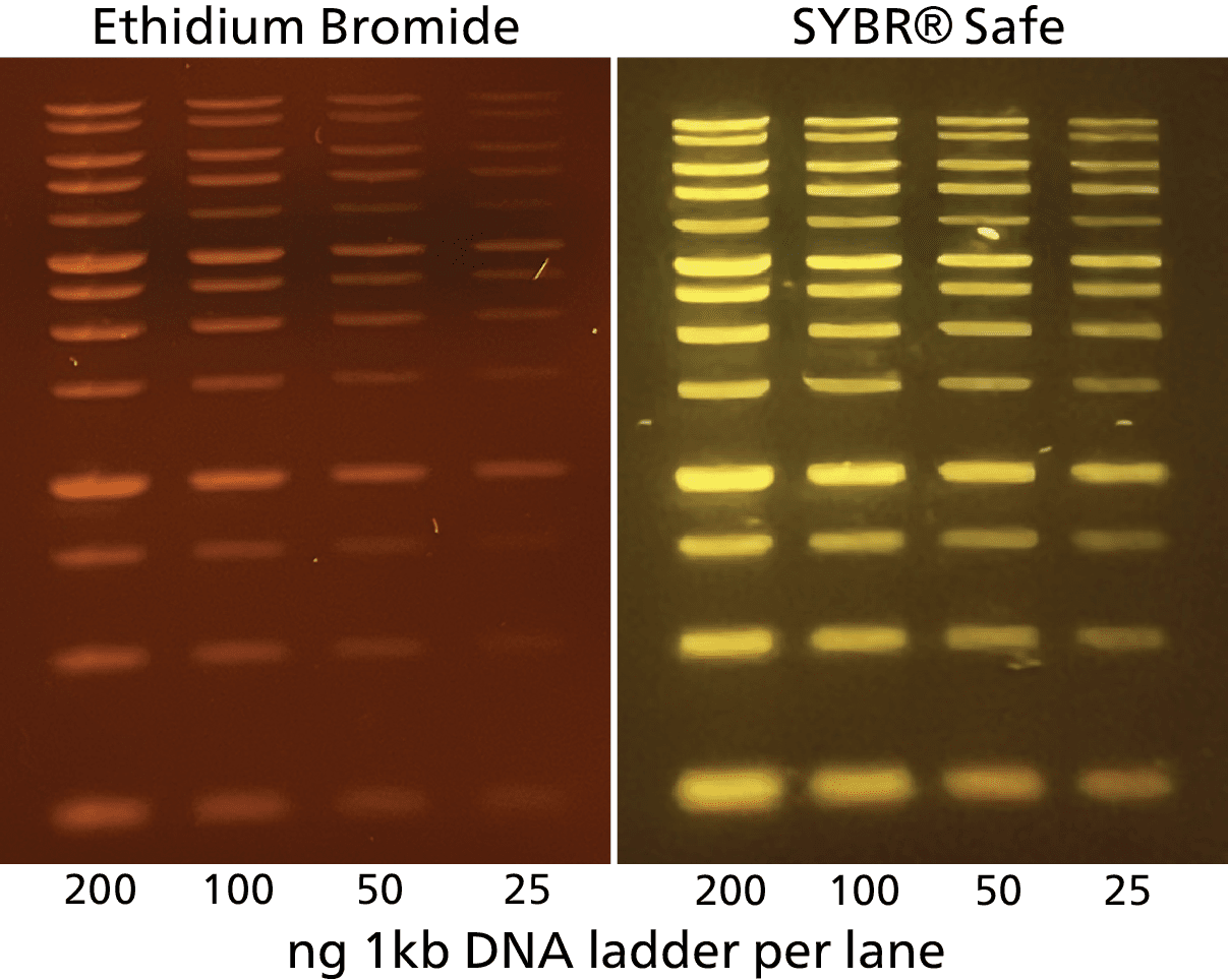 Comparison of Thermo Fisher Safe Imager™ 2.0 Blue-Light Transilluminator and Gel-Bright™ Laser Diode Gel Illuminator. An overview (top) is shown with the Safe Imager™ 2.0 Blue-Light Transilluminator (left) and Gel-Bright™ Laser Diode Gel Illuminator (right) in the same field of view, both with GelRed® (left) and GelGreen® (right) stained gels. The gels are a two-fold dilution series of Biotium’s Ready-to-Use 1 kb DNA Ladder (Cat. No. 31022) that were separated on 1% agarose TBE gels. From left to right, loading amounts were 25, 50, 100, or 200 ng/lane. The cyan (Safe Imager™) and green (Gel-Bright™) boxes indicate the field of view for the zoomed images of the gels shown below. Click to enlarge.