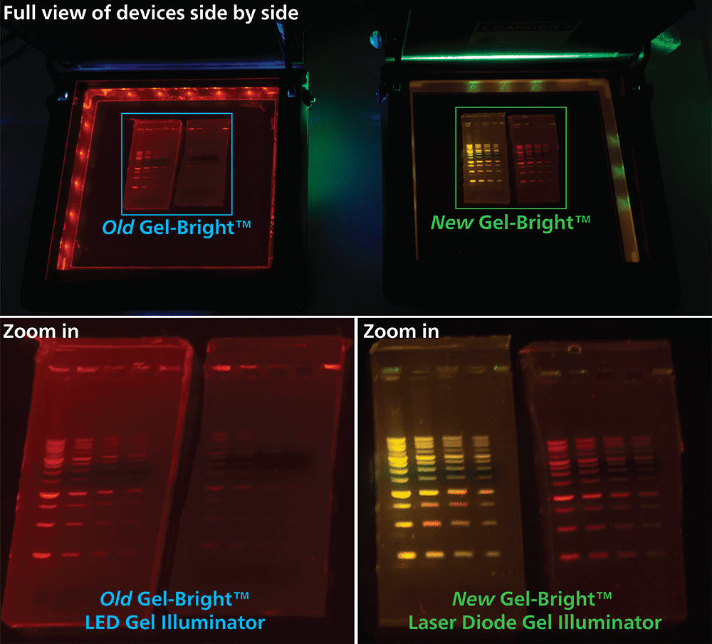 The Gel-Bright™ Laser Diode Gel Illuminator features a novel laser diode (LD)-based illumination technology that offers comparable performance to UV transilluminators while avoiding the hazards of UV light which can damage skin and eyes. UV light can also induce cross-linking and nicking of DNA in samples. Unlike blue LED gel illuminators such as Dark Reader or Safe Imager™ that are not compatible with red dyes, the Gel-Bright™ Laser Diode Gel Illuminator works well with both green dyes and widely used red dyes like GelRed®, ethidium bromide (EtBr), and One-Step Lumitein™ Protein Gel Stain.