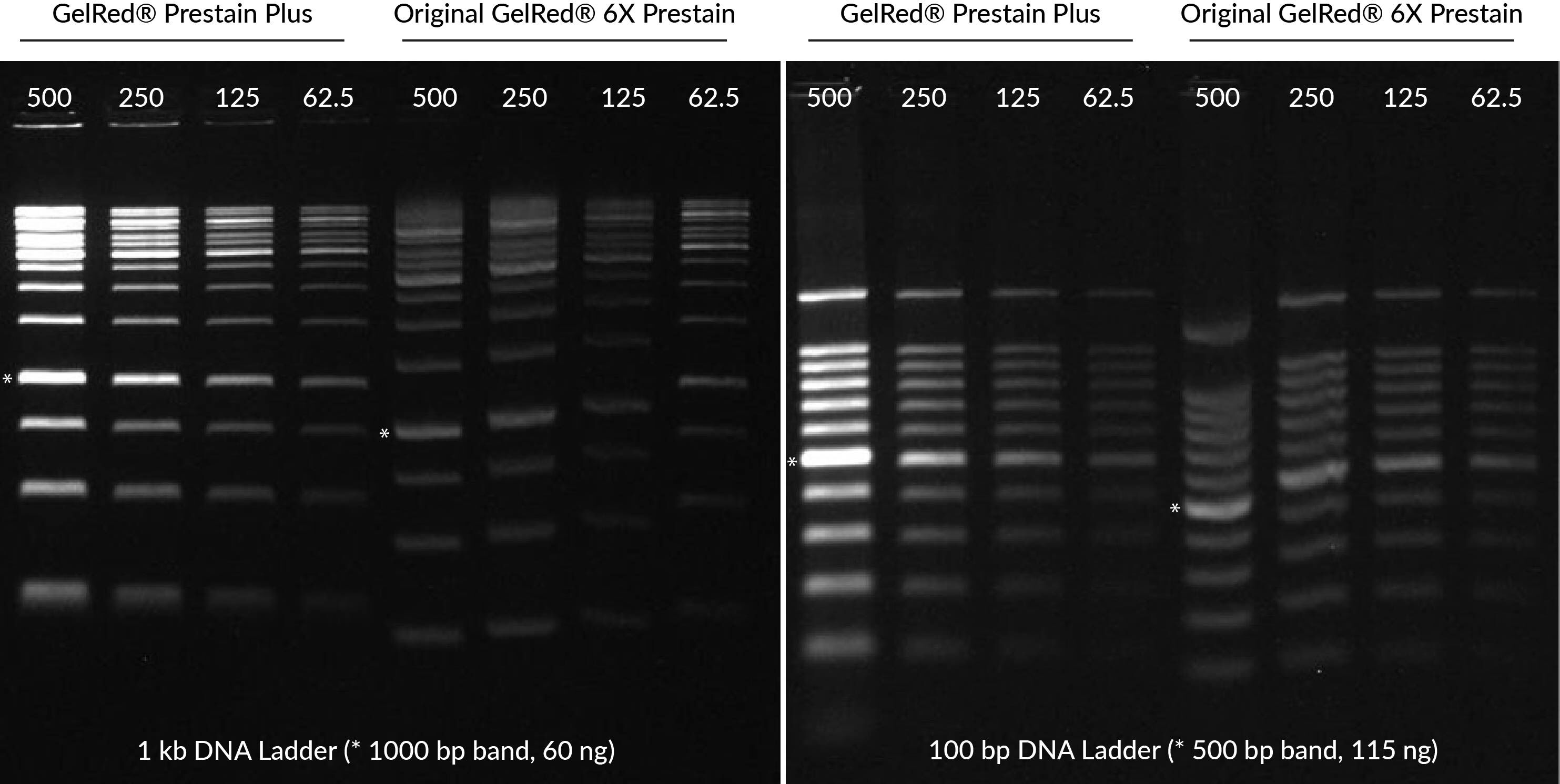 This product is an improved version of our original 6X GelRed® Prestain Loading Buffer (catalog number 41009) with brighter signal and more consistent DNA migration. When DNA is bound to GelRed® before electrophoresis, the ratio of dye to DNA can cause variable shifts in DNA migration, making it difficult to compare DNA fragment sizes between samples. GelRed® Prestain Plus 6X DNA Loading Dye is formulated to minimize this DNA migration shift, for greater consistency. GelRed® prestaining is simple and can avoid migration issues seen with GelRed® precast gels.