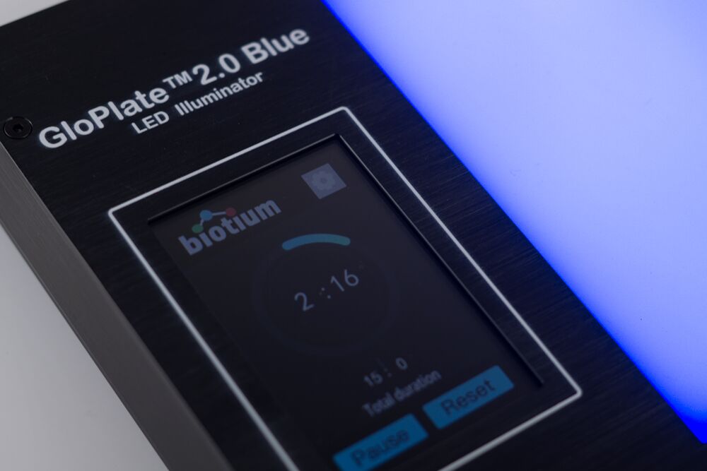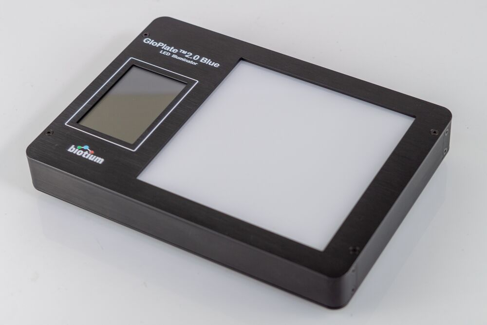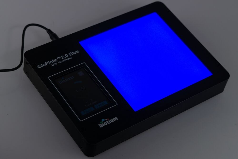 The Glo-Plate™ 2.0 Blue LED Illuminator is a new and improved version of the discontinued Glo-Plate™ Blue LED Illuminator (Cat. No. E90004). The new 2.0 design offers the same robust and uniform photoactivation performance as the original Glo-Plate™ Blue LED Illuminator, while also featuring a convenient touch display that allows users to easily set, reset, and monitor the device’s running time.