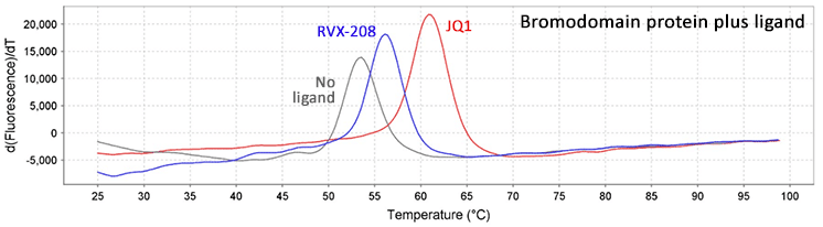 Small molecule inhibitors of bromodomain proteins have shown therapeutic effects in cancer models. Here, a GloMelt™ thermal shift assay was performed on 10 ug bromodomain BRD2 in the presence of bromodomain inhibitors JQ1 or RVX-208. Inhibitor binding stabilized the protein as indicated by the shift of the melting curves.