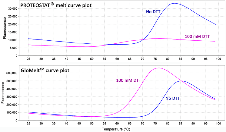 IgG melt curve plots in the presence of DTT. A thermal shift assay was performed on 25 ug IgG in the presence of 1X PROTEOSTAT® TS dye or 1X GloMelt™ Dye, using a QuantStudio™ 5 qPCR system. The presence of DTT drastically reduced the sensitivity of the PROTEOSTAT® assay, but had little affect on the GloMelt™ Dye. As expected, DTT reduced IgG thermal stability.