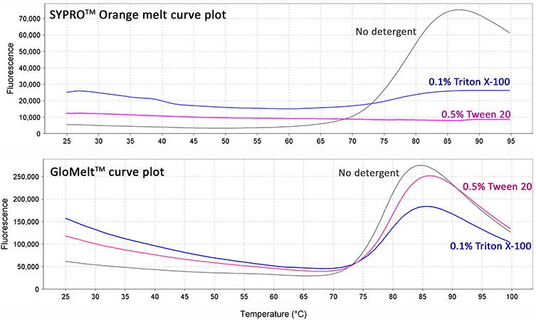 IgG melt curve plots in the presence of detergent. A thermal shift assay was performed on 20 ug IgG in the presence of 5X SYPRO® Orange or 1X GloMelt™ Dye, using a QuantStudio™ 5 qPCR system. The presence of detergent inhibited the SYPRO® Orange assay, but had little affect on the GloMelt™ curve.
