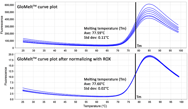 GloMelt™ Dye has significant advantages over other environmentally sensitive dyes, such as SYPRO® Orange and PROTEOSTAT® TS dye. GloMelt™ Dye generates a strong signal because it is optimized for detection in the SYBR® Green channel of qPCR instruments, and therefore low reaction volumes and low protein concentrations can be used. GloMelt™ Dye is compatible with high concentrations of protein stabilizers (such as glycerol and sorbitol), and also protein destabilizers (such as DTT and imidazole). GloMelt™ Dye performs very well in high detergent concentrations, unlike SYPRO® Orange. Another advantage is that ROX dye can be included with GloMelt™ Dye during thermal shift assays, which improves results by increasing replicate consistency in PCR instruments that require ROX passive reference dye.