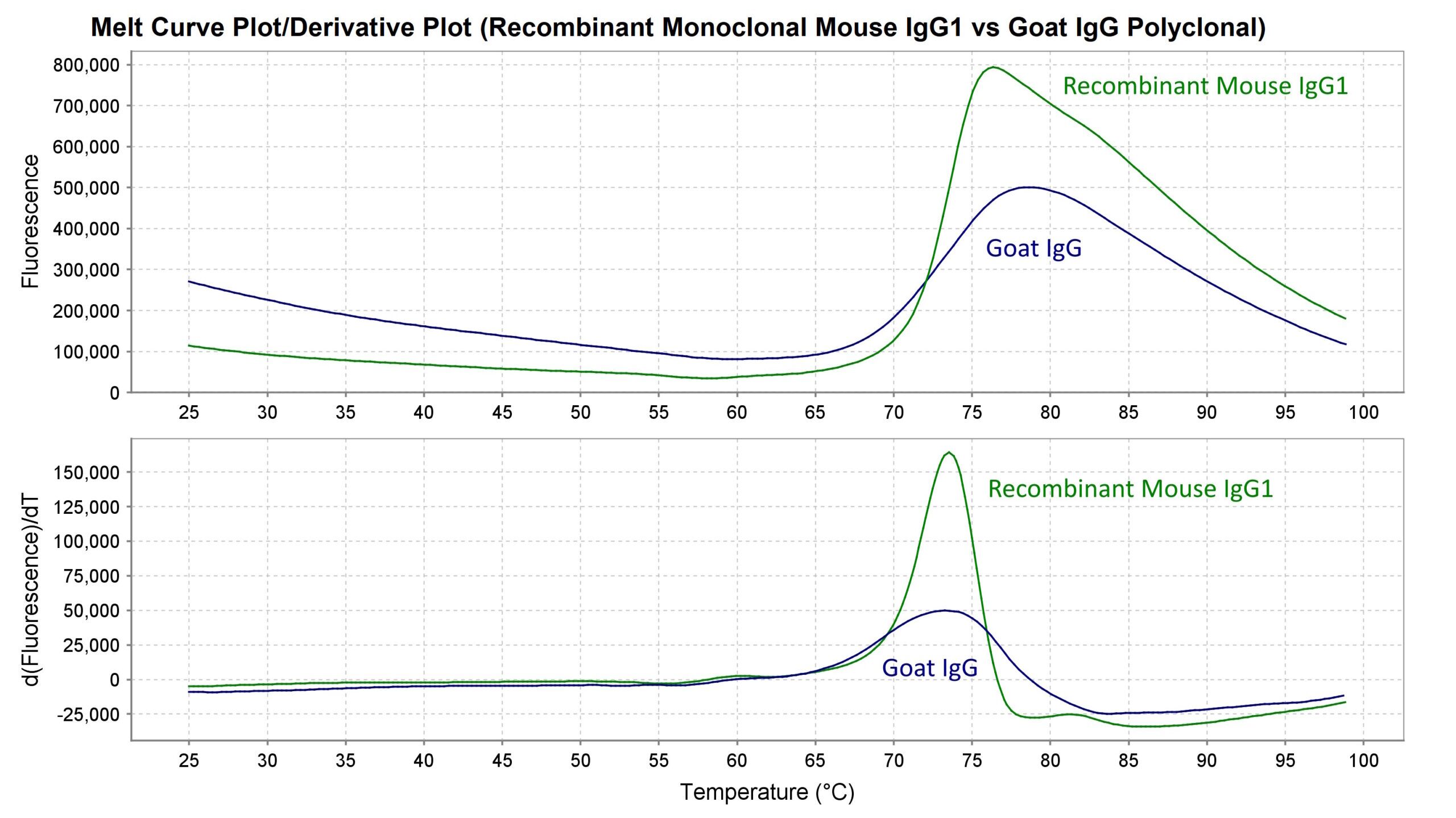 The GloMelt™ 2.0 Thermal Shift Protein Stability Kit features Recombinant Monoclonal Mouse IgG1 for performing control reactions. Compared to the polyclonal goat IgG control provided in our original GloMelt™ kit, this recombinant mouse antibody is more relevant for therapeutic antibody research and generates higher signal and a sharper melt peak between for robust assay validation.