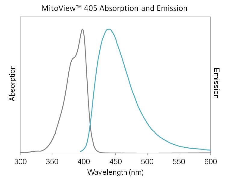 MitoView™ 405 is a blue fluorescent mitochondrial dye with absorbance/emission at 398/440 nm, suitable for detection by confocal microscopy or flow cytometry using settings for DAPI or Pacific Blue®. The dye is membrane permeable and becomes brightly fluorescent upon accumulation in the mitochondrial membrane. Mitochondrial localization is dependent on mitochondrial membrane potential; when membrane potential is disrupted the dye relocalizes to the cytoplasm, but still retains fluorescence. The dye is designed for use in live cells and is not fixable. MitoView™ 405 is a replacement for our original MitoView™ Blue*, and has improved photostability.