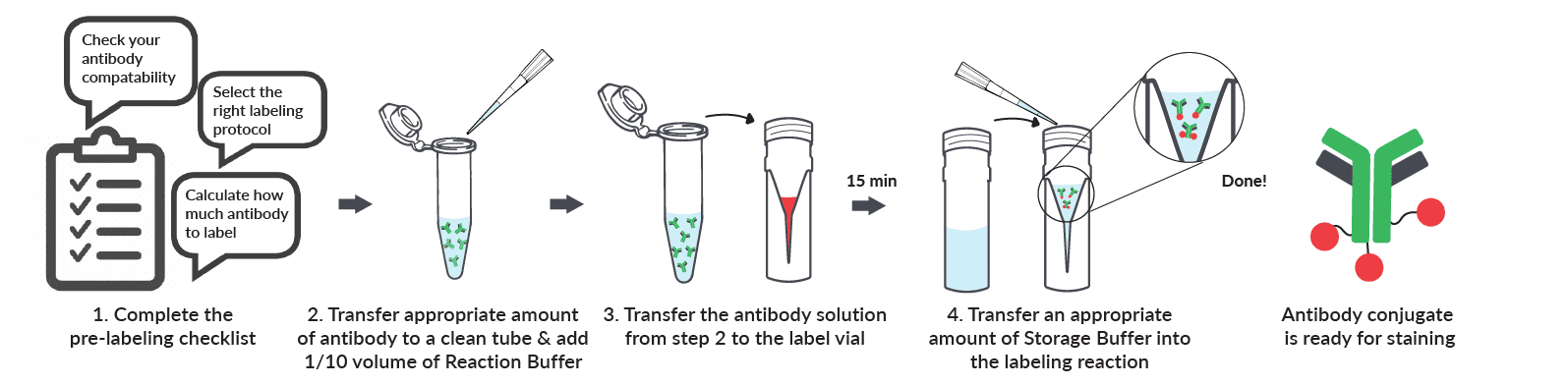 Mix-n-Stain™ Antibody Labeling Kits are very simple to use (see the workflow overview above). But before you begin, you must check that your antibody meets the compatibility requirements for labeling, and choose the right labeling protocol. Download the updated and expanded Product Protocol for a labeling check list to help you select the right kit size and labeling protocol for your antibody. Also see our Kit Compatibility and Protocol Selection Flowchart.