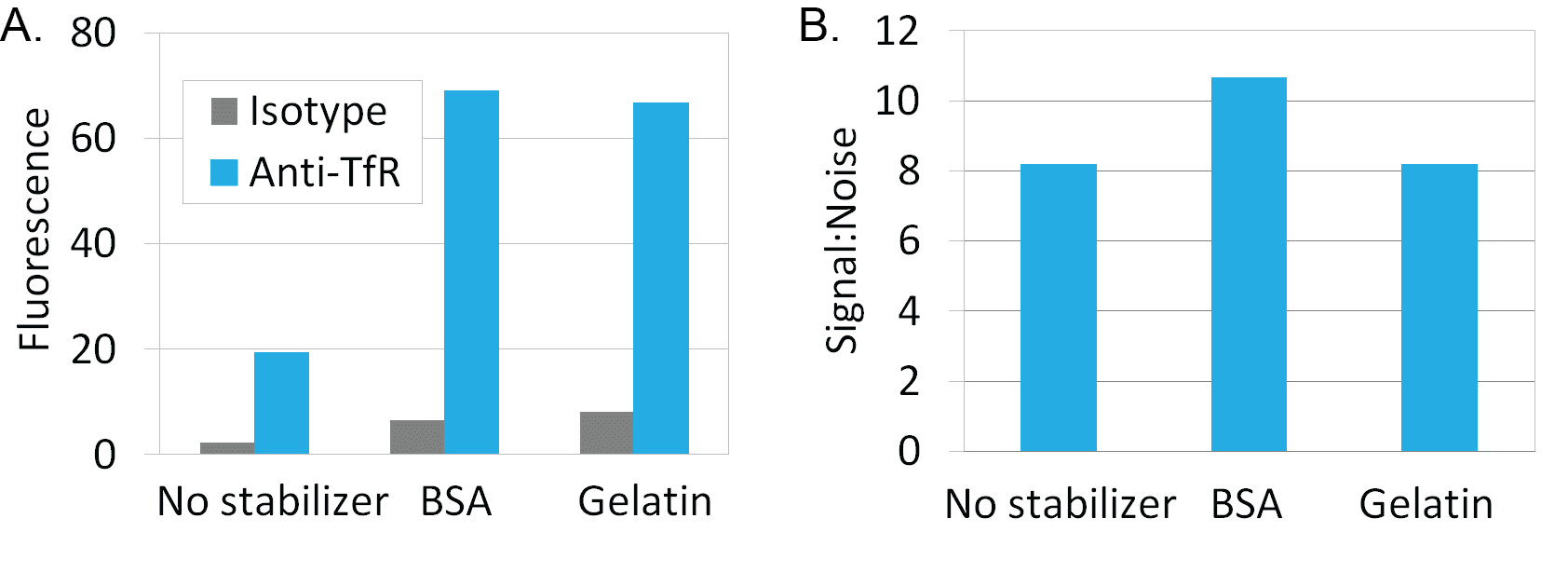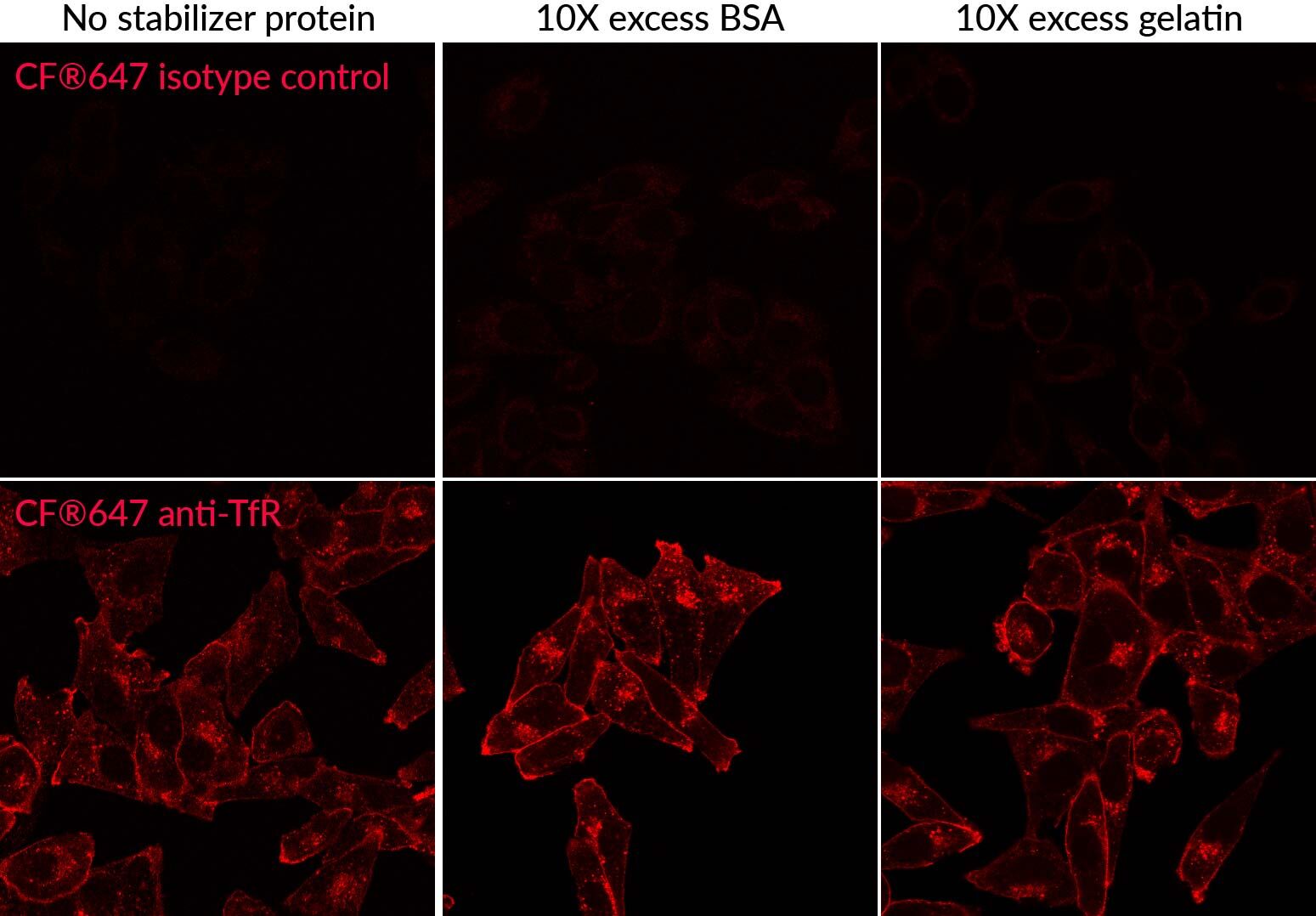 Mix-n-Stain™ labeling tolerates common antibody buffer formulations. An ultrafiltration centrifuge vial is provided to quickly remove interfering substances like glycerol, or to concentrate your antibody. With a slight modification in protocol, antibodies can be labeled in the presence of BSA, gelatin, or ascites fluid. Because CF® Dyes are highly water soluble, the presence of other proteins like BSA or gelatin in the labeling reaction has minimal effect on background fluorescence, because any labeled non-antibody proteins readily wash away during immunofluorescence staining.