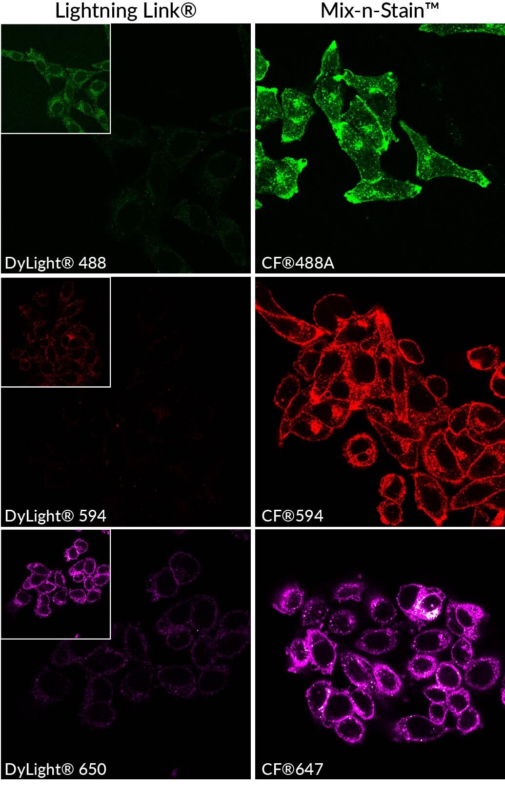 | Mix-n-Stain™ CF® Dye Antibody Labeling Kits | CF® Dyes | ≤5-20 ug IgG 20-50 ug IgG 50-100 ug IgG | ~ 15 min. | • Rapid, simple labeling • No purification • Tolerates BSA & other additives • Dyes for super-resolution, spectral flow, & NIR detection |