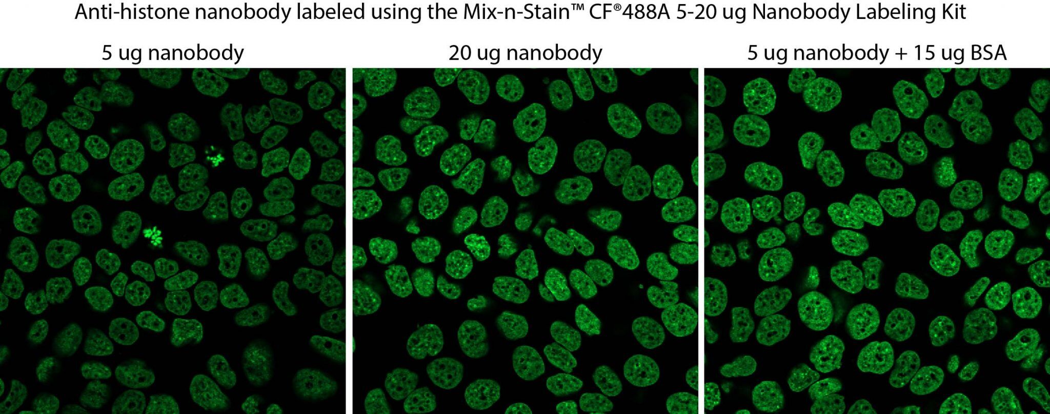 | Mix-n-Stain™ Nanobody Labeling Kits | CF® Dyes | 5-20 ug Nanobody® 20-50 ug Nanobody® | ~ 30 min. | • Optimized for Nanobodies® • Tolerates BSA & other additives |