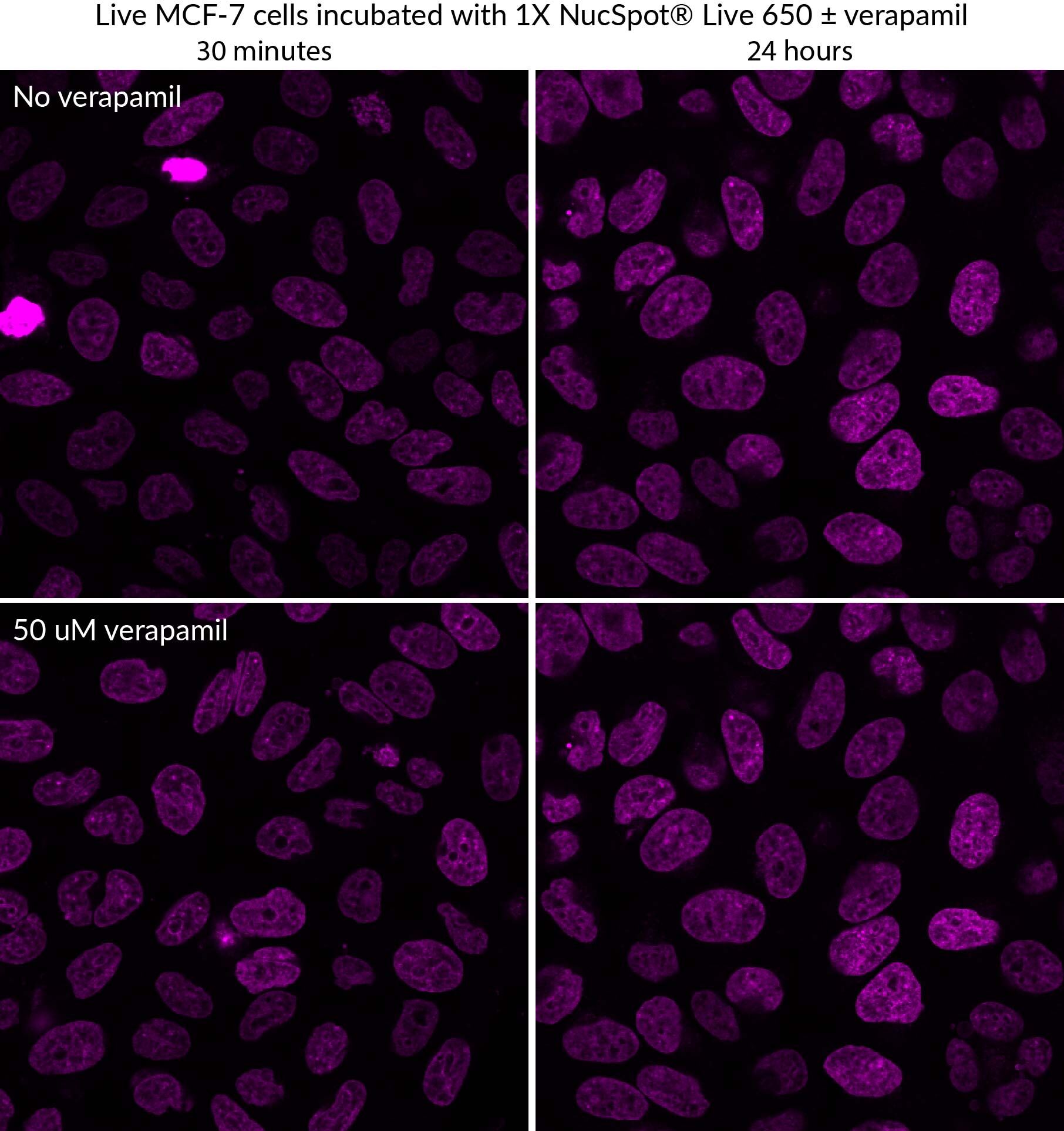 NucSpot® Live 488 stains nuclei with green fluorescence for the FITC channel, while NucSpot® Live 650 has far-red fluorescence for the Cy®5 channel. NucSpot® Live 650 dye also is compatible with super-resolution imaging by SIM or STED, and has been validated in STORM (Ref. 4). The dyes are supplied as 1000X stock solutions in DMSO, and are supplied with a vial of the efflux pump inhibitor verapamil for optional use, which may increase probe retention and live cell staining in some cell types. Note: NucSpot® Live 488 and NucSpot® Live 650 have dim blue fluorescence in the DAPI channel, and may not be suitable for multicolor imaging with blue probes.