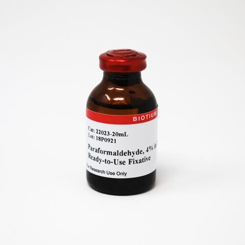 Paraformaldehyde solid and formaldehyde solution and vapor are toxic and carcinogenic, so preparing fresh fixative from paraformaldehyde solid is not only inconvenient, but also hazardous. Biotium’s paraformaldehyde fixative is a convenient and safer alternative to preparing fixative from scratch. Our paraformaldehyde fixative is stabilized by packaging under inert argon gas in amber glass bottles.