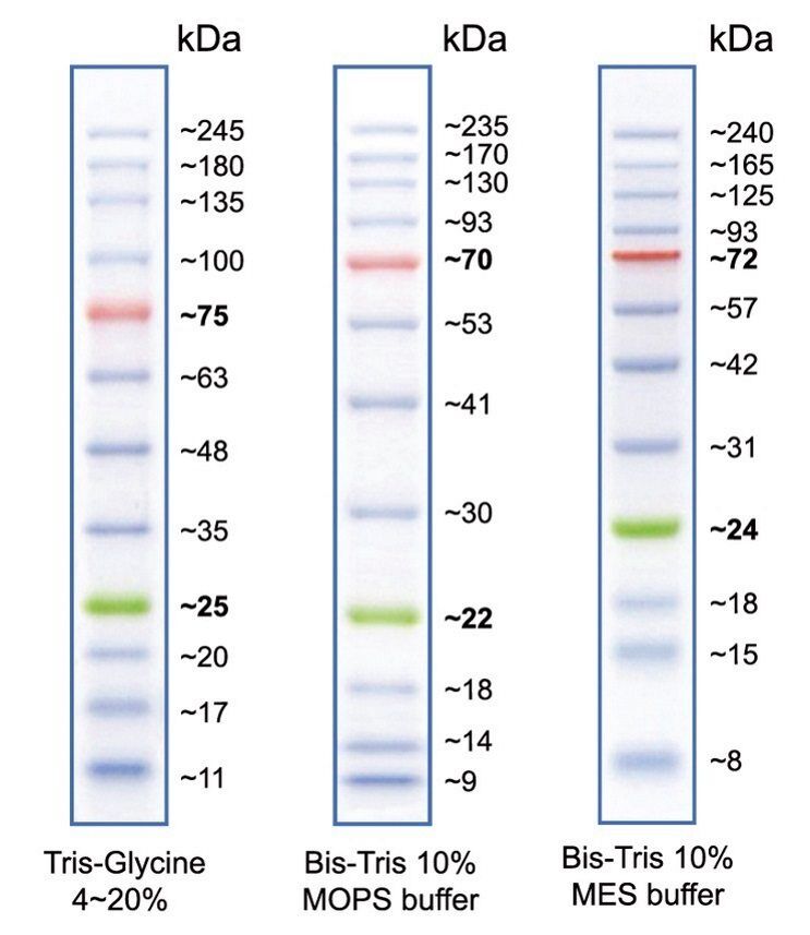 A visible three-color protein marker for SDS-PAGE or western blotting, with 12 bands ranging from 8 to 245 kDa.