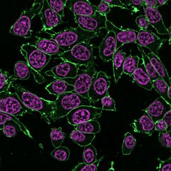 RedDot™2 provides excellent nuclear counterstaining in fixed and permeabilized cells and tissue sections without the need for RNase treatment to remove cytoplasmic RNA. The dye is highly thermostable and photostable, providing convenient handling and ideal for demanding applications such as confocal microscopy. RedDot™2 has also been validated for tissue clearing protocols such as CUBIC. RedDot™2 can be efficiently excited by wavelengths from 488 to 647 nm, and therefore can be used with the 488 nm flow cytometry laser line. Please note: far-red dyes like RedDot™2 are not visible to the human eye, but must be imaged with a CCD camera or by confocal microscopy.