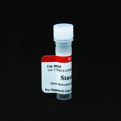 Staurosporine inhibits a wide variety of protein kinases by competing for the ATP binding site. It is a potent and cell-permeable competitive inhibitor for protein kinase C (IC50 = 0.7 nM), protein kinase A (IC50 = 7 nM), and protein kinase G (IC50 = 8.5 nM) (1,2). Staurosporine induces apoptosis in human neuroblastoma cells and chick embryonic neurons (3,4).
