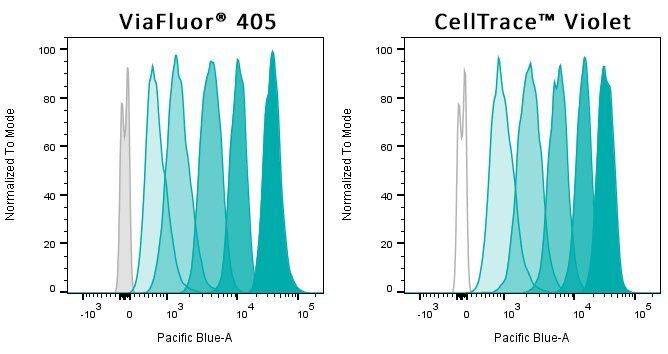 | ViaFluor® 405 SE Cell Proliferation Kit | 30068 | 408/452 | Pacific Blue® | • Track cell division by dye dilution using flow cytometry • ViaFluor® 488 is a unique, improved green dye to replace CFSE • ViaFluor® 405 replaces CellTrace™ Violet • ViaFluor® 650 replaces CellTrace™ Far Red |
