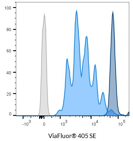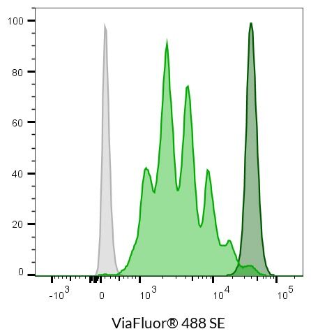 ViaFluor® SE dyes are membrane-permeant compounds that are initially non-fluorescent esters, but are converted to fluorescent dyes by intracellular esterases and will covalently react with amine groups on intracellular proteins at the same time, forming fluorescent conjugates that are retained in the cell. Immediately after staining, a single bright fluorescent population will be detected by flow cytometry. With each cell division, daughter cells inherit roughly half of the fluorescent label, allowing the number of cell divisions that occur after labeling to be detected by the appearance of successively dimmer fluorescent peaks on a flow cytometry histogram compared to cells analyzed immediately after staining. Thus, cell proliferation dyes can be used to track multiple cell divisions of cells grown in culture or injected in vivo after labeling with the ViaFluor® SE dye.