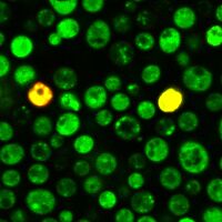 S. cerevisiae stained with the Yeast Live-or-Dye™ Fixable Live/Dead Staining Kit: Thiazole Orange to stain all cells (green) and Live-or-Dye™ 568/583 to stain dead cells (red, appears yellow in overlay).