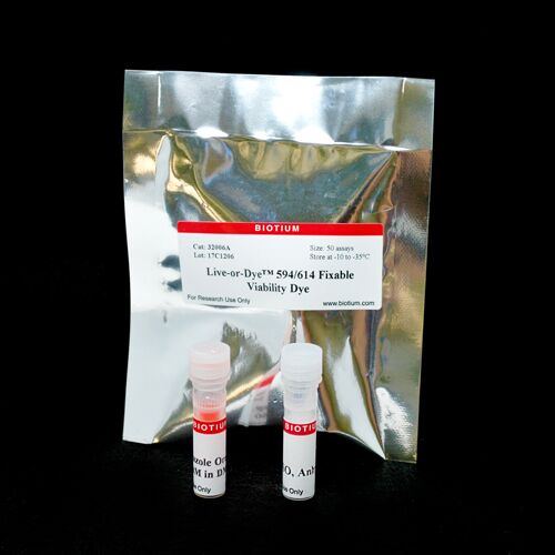 Live-or-Dye™ 568/583 is a cell membrane impermeable amine-reactive dye. It is able to enter into dead cells that have compromised membrane integrity and covalently label free amines on intracellular proteins. This dye labeling is extremely stable, allowing the cells to be fixed and permeabilized without loss of fluorescence or dye transfer between cells. It is suitable for detection by fluorescence microscopy or flow cytometry.
