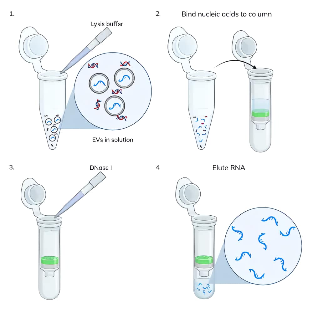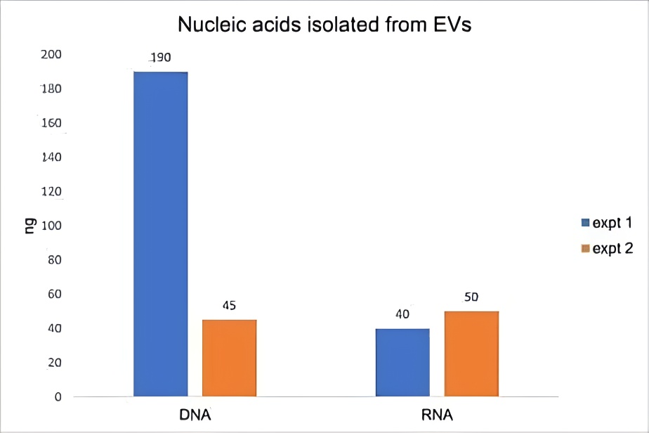 In addition to RNA, it has sometimes been reported that EVs also contain DNA. However, most recent publications suggest that the DNA isolated from EVs is external to the EV, and not inside the EV lumen (Ref. 3). During the course of our work developing an RNA isolation kit, we were surprised by the large quantity of DNA that was co-isolated along with the RNA in cell culture-derived EVs, particularly if no DNase treatment was performed. We wondered if this DNA was external to the EVs, and if so, whether it could be removed from the EVs prior to RNA isolation.