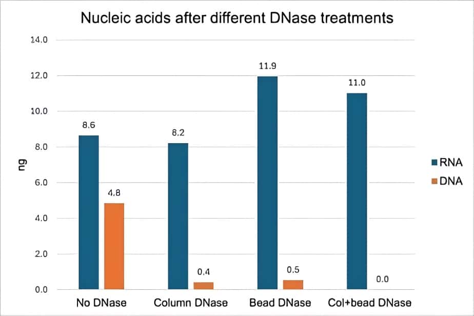 In examining this data, we noticed an interesting phenomenon: in both of the samples where the EVs were treated with external DNase prior to lysis (i.e., “Bead DNase” and “Col+bead DNase”) the yield of isolated RNA was higher than the no-DNase sample, by 28-38% (Fig. 2, blue bars). This experiment was performed twice with EVs isolated from two different cell lines (Jurkat and MCF-7), and the yield improvement with pre-DNase treatment was observed in both instances.