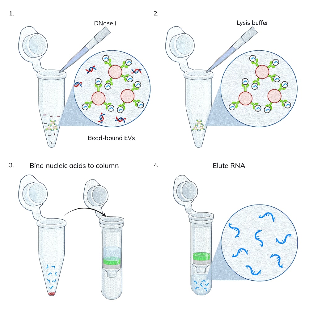 These results suggest that one way to generate high yield and high purity RNA from EVs is to perform a DNase treatment of the EVs prior to lysis and nucleic acid purification. However, there are some caveats. This procedure is currently only practical for EVs that are captured onto beads or in some other manner that allows washing, and since a capture molecule such as an antibody may not capture every EV in a sample, some EVs will likely be lost, and the remaining EV population may display a bias based on the capture molecule. However, as more efficient EV capture technologies are developed, this process will become more practical for broad use.