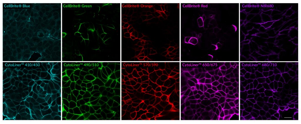 Figure 1. Comparison of fixed cell staining with CytoLinerTM Fixed Cell Membrane Stains versus the classic CellBrite® Cytoplasmic Membrane Dyes. In comparison to the CellBrite® lipophilic carbocyanine dyes, CytoLinerTM Dyes show more uniform and reliable staining of paraformaldehyde-fixed, mildly-permeabilized cell membranes. Paraformaldehyde-fixed cells were permeabilized for 10 minutes at room temperature with 0.1% Triton® X-100 in PBS, then rinsed with PBS and stained with CellBrite® Dyes in PBS or CytoLinerTM Stains in 1X CytoLinerTM Buffer for 10 minutes at room temperature, then rinsed with PBS. Imaged by confocal microscopy; scale bar: 20 um.