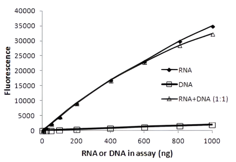 | AccuBlue® Broad Range RNA | RNA | 5-1000 ng | 650/670 | Fluorescence microplate reader or Qubit® fluorometer | The widest linear range of available RNA quantitation kits Exceptional accuracy, sensitivity, and high RNA selectivity |