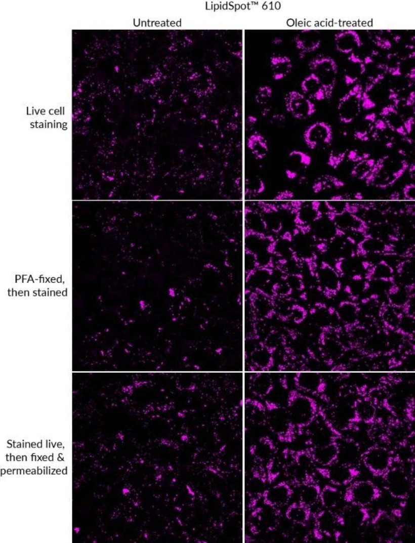 CytoLiner™ staining is compatible with formaldehyde fixation and mild detergent permeabilization before cellular staining. Staining can tolerate blocking agents used during immunofluorescence staining protocols, allowing subsequent staining with antibodies and other probes.