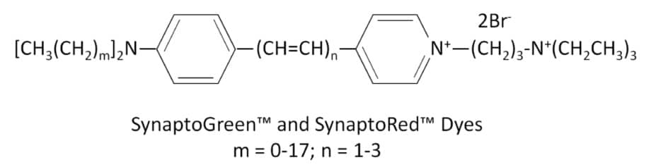 SynaptoGreen™ and SynaptoRed™ nerve terminal probes (originally called FM® dyes) are membrane dyes used to trace endocytic vesicles. They are a series of fluorescent cationic styryl dyes developed to follow synaptic activity at neuromuscular junctions or synapses.