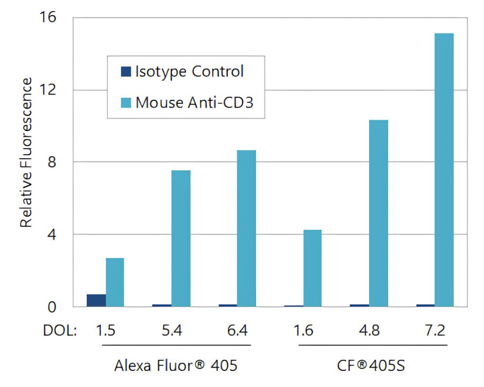 CF®405S is a blue fluorescent dye with an absorption peak wavelength matching the 405 nm blue diode laser line (Figure 1). In addition, the emission peak wavelength of the dye is well-centered within the blue detection window of BD flow cytometers. As a result, flow cytometry analysis using CF®405S dye results in much brighter signal than that using Alexa Fluor® 405 (Figure 2). CF®405S also has been validated in super-resolution imaging by SIM.