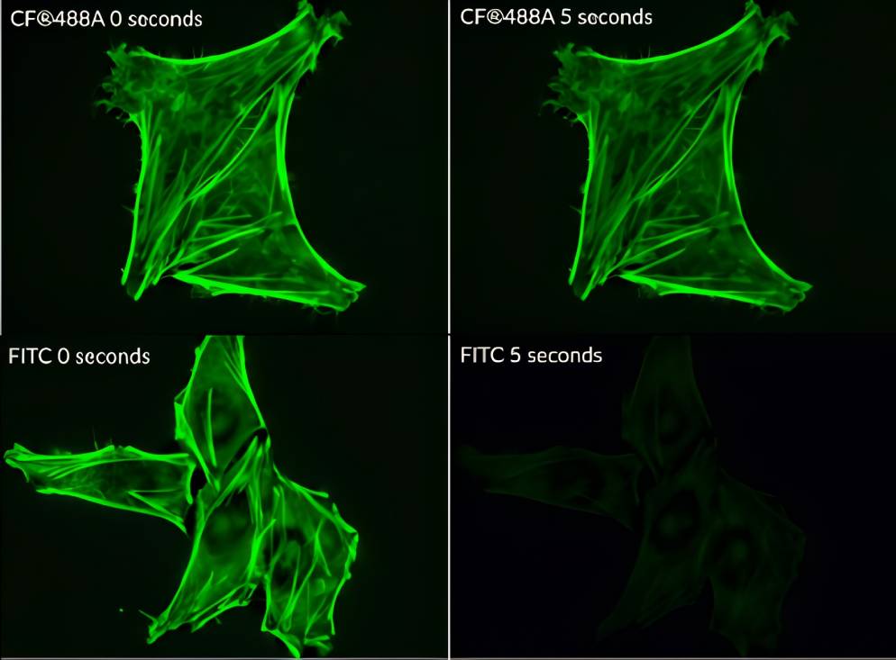 CF®488A is a green fluorescent dye for the 488 nm argon laser line. CF®488A is at least as bright as Alexa Fluor® 488. However, Alexa Fluor® 488 carries multiple negative charges, which can significantly alter antibody specificity. CF®488A is minimally charged, for high specificity. CF®488A also has a shorter emission wavelength than Alexa Fluor® 488 and FITC, for less fluorescence spill-over into the red channel. CF®488A has been validated in STED and TIRF super-resolution imaging methods (learn more about CF® Dyes for Super-Resolution Imaging).