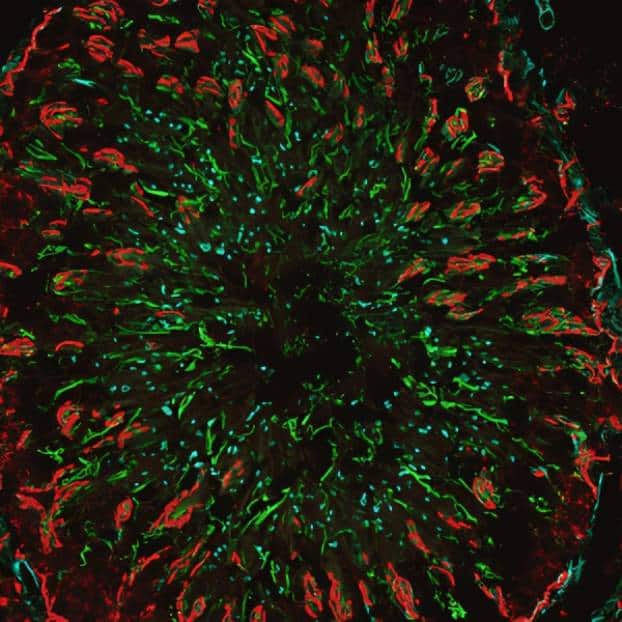 CF®555 is an orange-red fluorescent dye spectrally similar to Cy®3 and Alexa Fluor® 555. Like Alexa Fluor® 555, CF®555 is much brighter and more photostable than Cy®3. However, unlike Alexa Fluor® 555, which carries 4 negative charges, CF®555 achieves its superior performance without being excessively charged. Labeling antibodies with a highly charged dye can dramatically change the isoelectric point of the antibody, leading to increased background staining. CF®555 has been validated in multi-color STORM imaging (learn more about CF® Dyes for Super-Resolution Imaging).