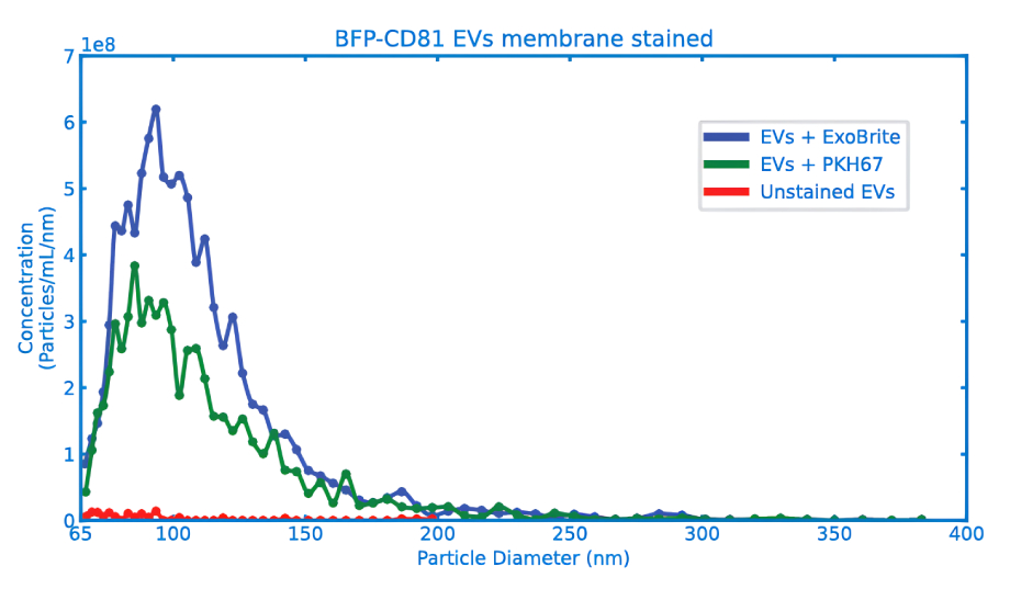 | ExoBrite™ Annexin EV Staining Kits | • Broad compatibility with different EV sources • Validated for flow and fNTA • Low background aggregates | • May not stain every EV in a sample • Doesn't work well on bead-bound EVs |